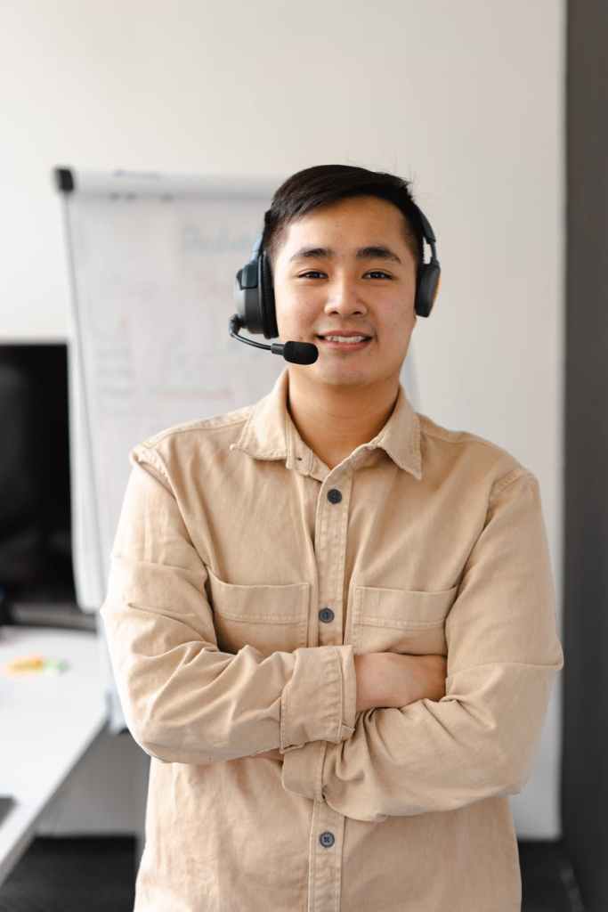 A happy man with a stereo headset.